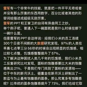 比如平时东谈主作念份八宝粥,可能只会说“我今天早上在家煮了一锅粥”,但在雷军的嘴里,它形成了:“历程咱们小米职工不时300个昼夜不终止的大数据商讨,咱们发现96%的东谈主早上7:08分55秒会有热烈的饥饿感,比7:00增多49%!