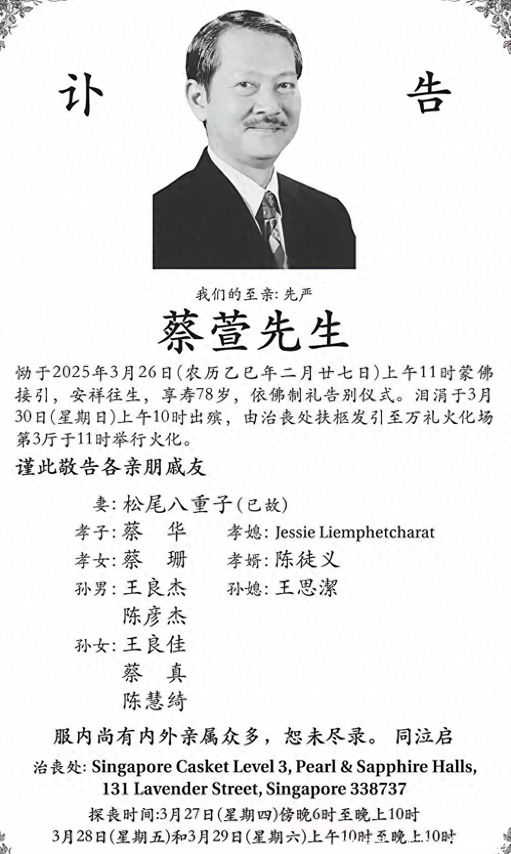 最终,蔡萱于3月26日上昼11时升天,享年78岁。