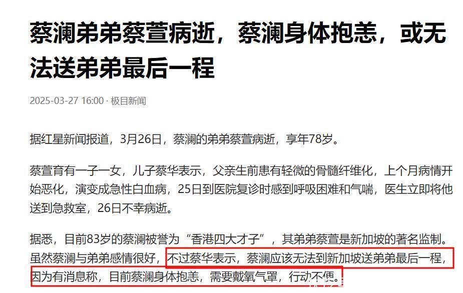 3月26日,香港闻名才子蔡澜的弟弟、新加坡闻名电视制作主谈主蔡萱升天,享年78岁。