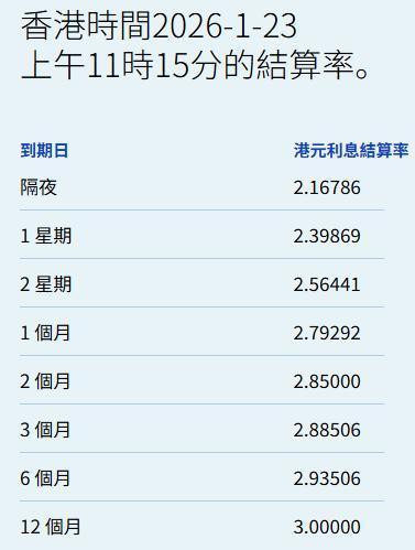 智通财经APP获悉,1月23日,港元拆息多量向下,而与楼按相干的一个月拆息由升转跌报2.79292%波胆·足球,跌1.113基点;反馈银行资金老本的三个月拆息报2.88506%,跌2.06基点。